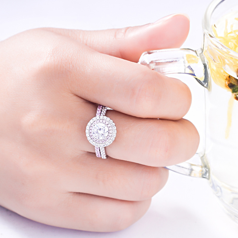 S925 Silver Round Pink Zircon Ring Set for Women – Stackable Wedding & Promise Jewelry